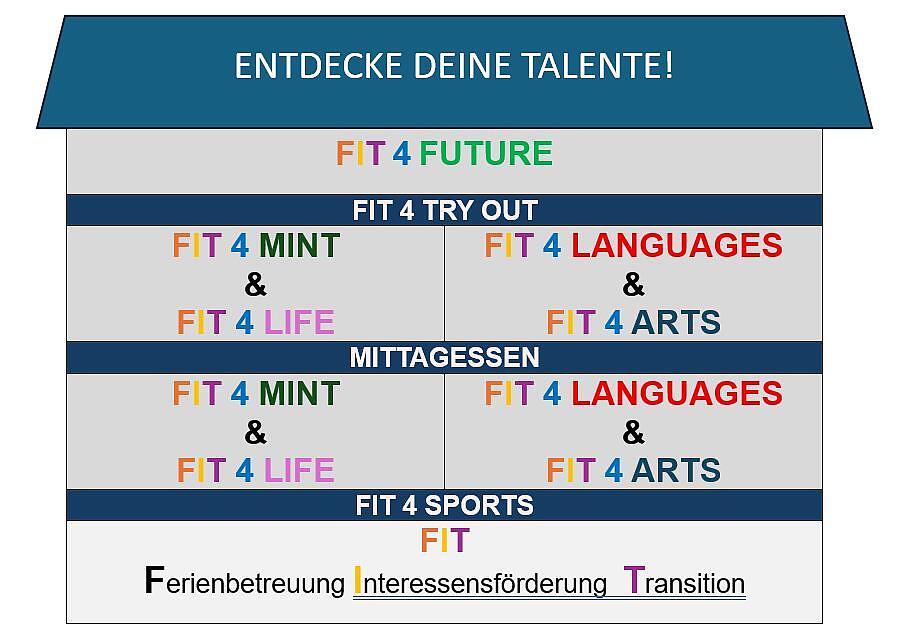 Das Kind mit den individuellen Kompetenzen und Interessen steht im Mittelpunkt sämtlicher Überlegungen. Dabei werden neben der täglichen Bewegungseinheit (Fit4Sports) und regionalen besonderen Angeboten (Fit4TryOut) die beiden Schwerpunkte des naturwissenschaftlichen und lebenspraktischen Bereichs (Fit4MINT & Fit4Life) und des Sprachen- und Kreativitätsbereichs (Fit4Languages & Fit4Arts) angeboten.